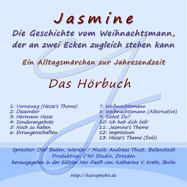 "Die Geschichte vom Weihnachtsmann, der an zwei Ecken zugleich stehen kann" ist eine Weihnachtsgeschichte, nicht nur für Kinder. Geschrieben von Jasmine, verlegt von Katharina V. Krebs, eingesprochen von Olaf Baden und von mir musikalisch umrahmt. Weiter Infos unter http://jasmine-texte.de